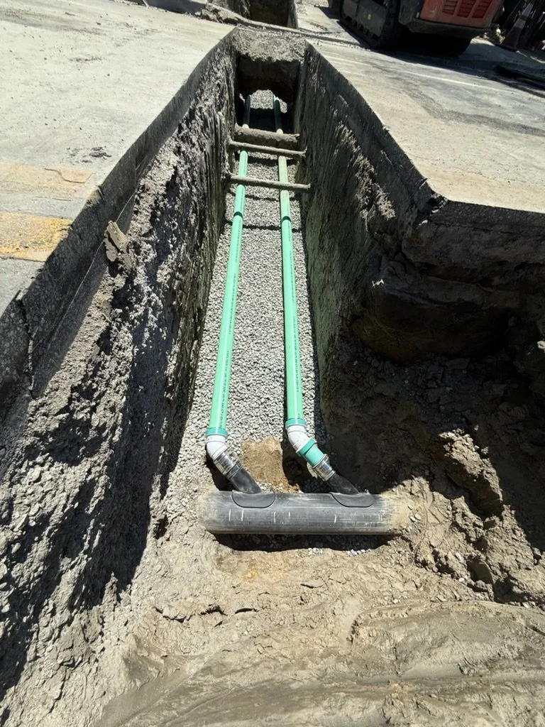 Sewer force mains are necessary when gravity flow is not sufficient to move water runoff and sewage through a gravity line. Force mains move wastewater under pressure by using pumps or compressors located in lift stations. They convey wastewater from a lower to higher elevation or where construction of a gravity line would result in excessive excavation depths and prohibitive sewer line costs. A sewer force main will always include pipe, valves, a device to control flow and a force main cleaning system. We install eone grinder pump with hdpe 1 1/4" tap into 2" hdpe street mains.